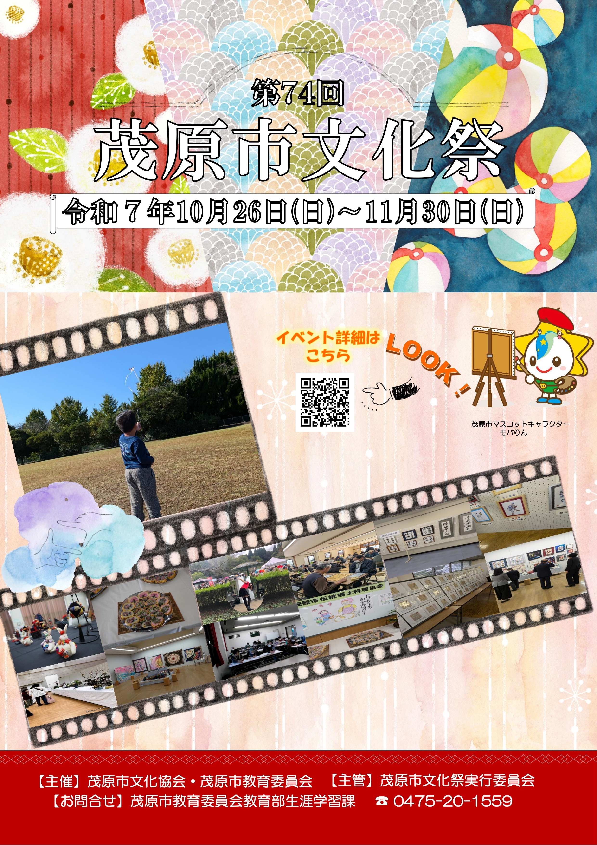 第74回「茂原市文化祭」について、令和7年10月26日(日曜日)から11月30日(日曜日)の期間に、茂原市美術館・郷土資料館の他、市内全8会場にて開催を予定しております。ぜひ皆さまお誘いあわせの上、ご参加ください。