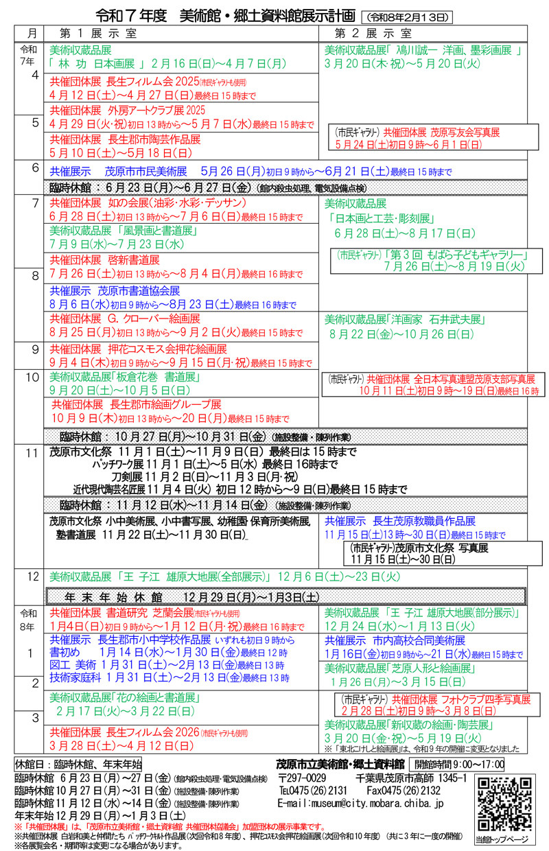 美術館の展示は、「美術収蔵品展」、「茂原市文化祭」、「共催展示」、「共催団体展」に大別されますので、下記に分類して掲載します。