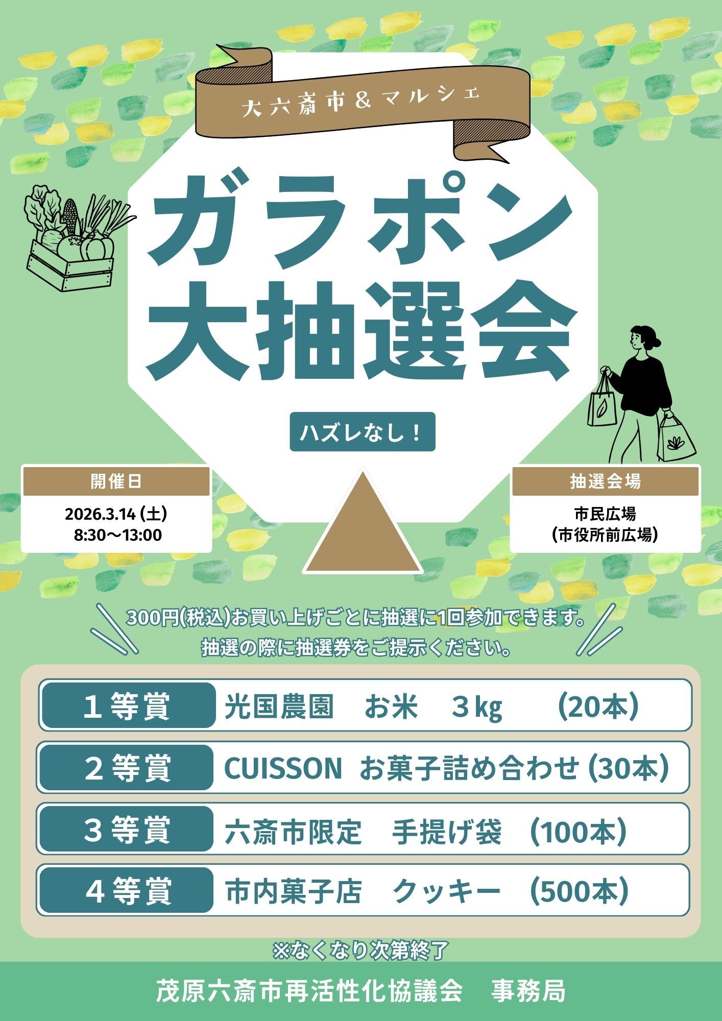 大六斎市&マルシェにて、300円(税込)お買い上げごとに抽選に1回参加できます。